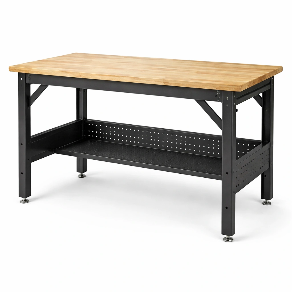 Banco de trabajo de acero negro con superficie de bambú y estante inferior