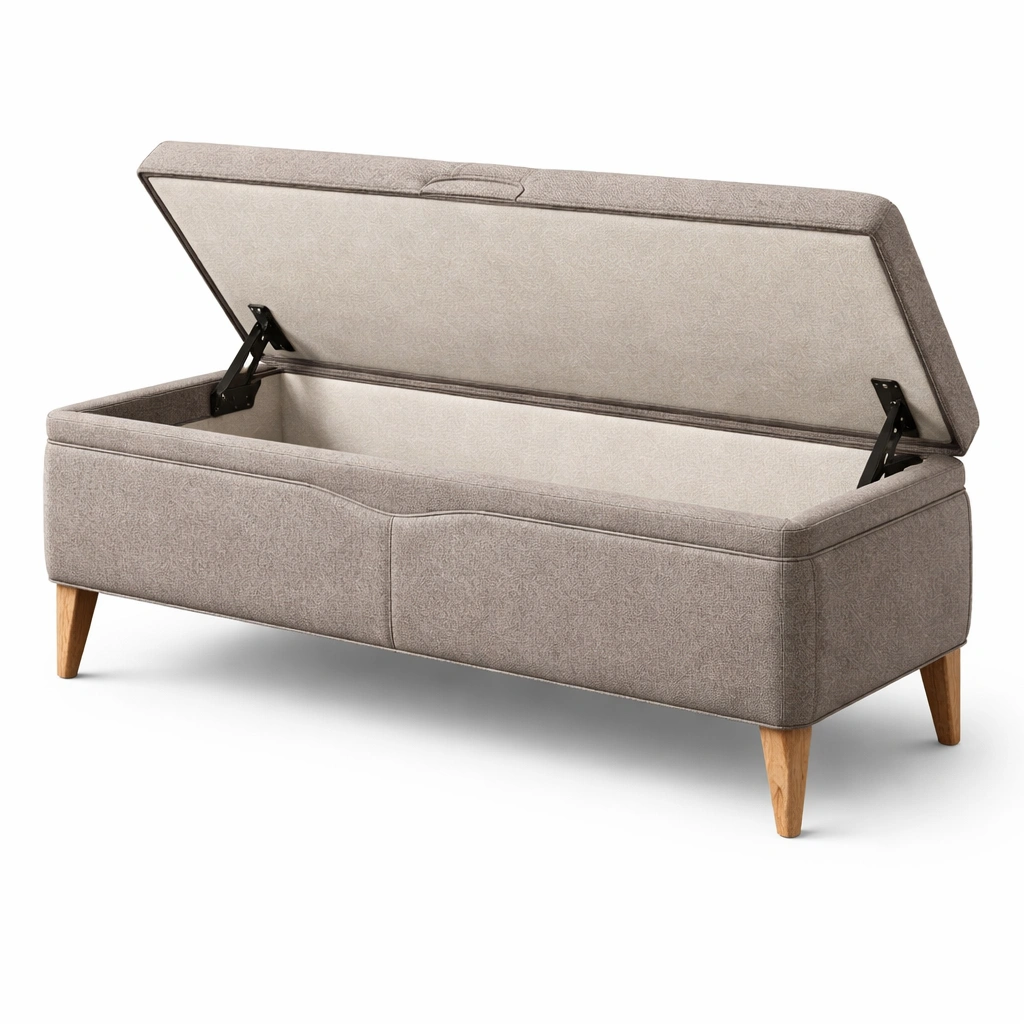 Banco de almacenamiento tapizado en tela de poliéster con patas de madera maciza.
