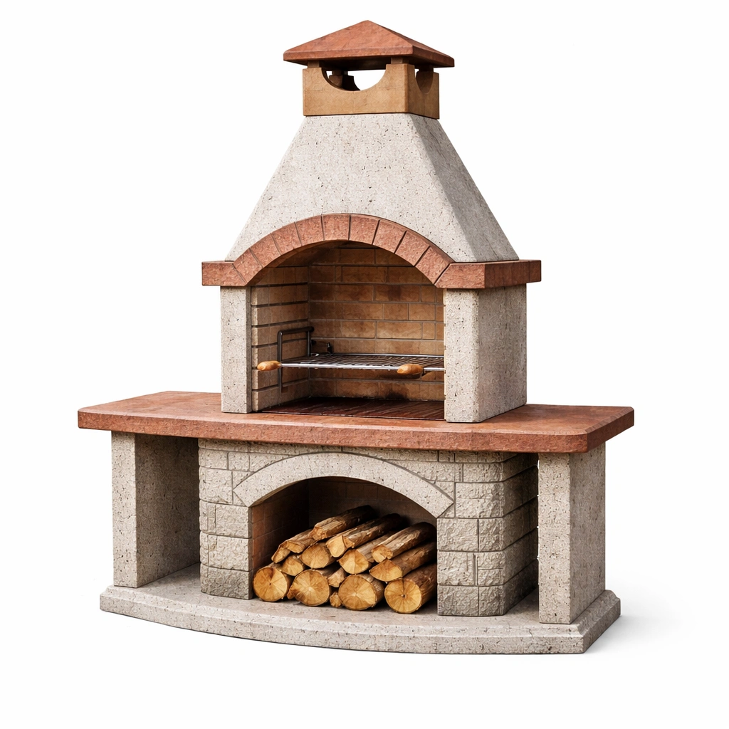 Características: Almacenamiento inferior para leña, chimenea integrada.